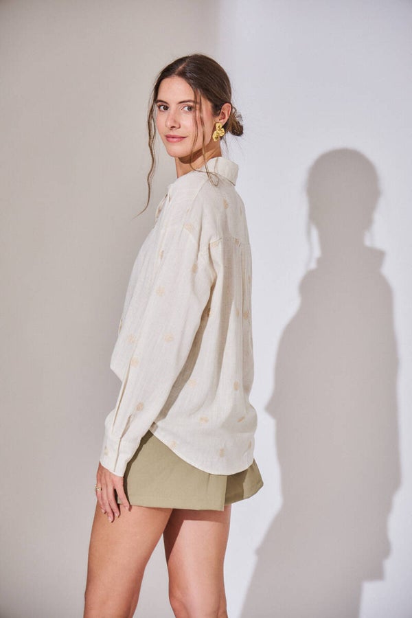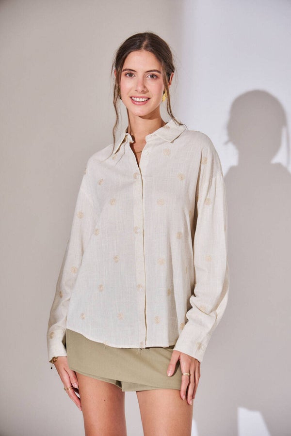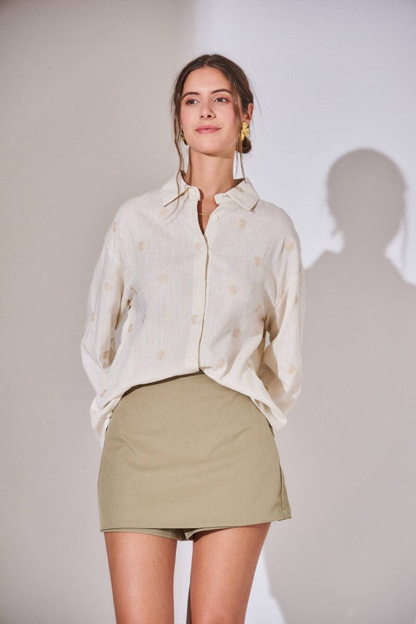 Cotton fluid shirt with washer embroidery beige